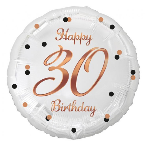 Happy Birthday White-Rose Gold 30 fólia lufi 36 cm Fólia léggömb, mely héliummal vagy levegővel tölthető. A lufi önzárószeleppel van ellátva, amely megakadályozza a gáz elszökését. Mérete 36 cm Anyaga: fólia A lufi tartó pálca + csésze külön megvásá