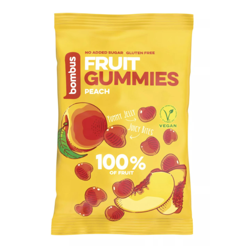 Őszibarack ízű vegán gumicukorka hozzáadott cukor nélkül. Összetevők: 97% gyümölcslevek és pürék (sűrített almalé, sűtített almapüré, sűrített őszibarackpüré 3% sűrített őszibaracklé 1%) zselésítő anyag: pektin, sűrített citromlé, citrusrost, természet