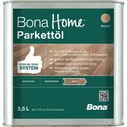 Bona Home parkettaolaj nyers fapadlók impregnálásához/ első tisztításához. Nagyon magas olajtartalom és alacsony oldószertartalom. Könnyen felvihető, kiváló impregnálási tulajdonságokkal. Előkészítés: Csiszolja le a padlót a nyers fáig. A felületnek száraznak és a csiszolás során keletkező portól és egyéb szennyeződésektől mentesnek kell lennie. Az olajnak szobahőmérsékletűnek kell lennie, mielőtt feldolgozásra kerülne, és használat előtt alaposan fel