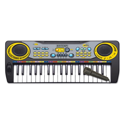 A Bontempi 37 billentyűs szintetizátor 8 hang, 8 ritmus, 5 előre felvett dallam, 4 dobhangzás, 4 rutmusvariáció, 4 hangeffekt lejátszására képes. Az előadást a felvétel és visszajátszás funkció, ritmus programozás, az állítható hangerő és tempó teszi még élvezetesebbé. A csomagolás tartalmaz egy mikrofont is, ami a szintetizátorhoz csatlakoztatható. Adapter csatlakoztatására van lehetőség, a csomagolás adaptert nem tartalmaz. A játék 4 db AA elemmel is műkö