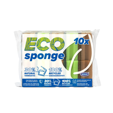A 10 darabos kiszerelésű BONUS formázott mosogatószivacs igazán gazdaságos, így egyetlen csomaggal akár az egész háztartás igényét kielégíthetjük. Szivacsrétege 30%-ban természetes anyagból készült, míg dörzsi rétege 100%-ban újrahasznosított anyagból, íg