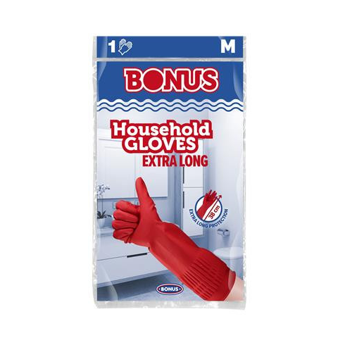 1 kép Bonus Gumikesztyű, háztartási, latex, extra hosszú, 38 cm, M méret, BONUS, piros