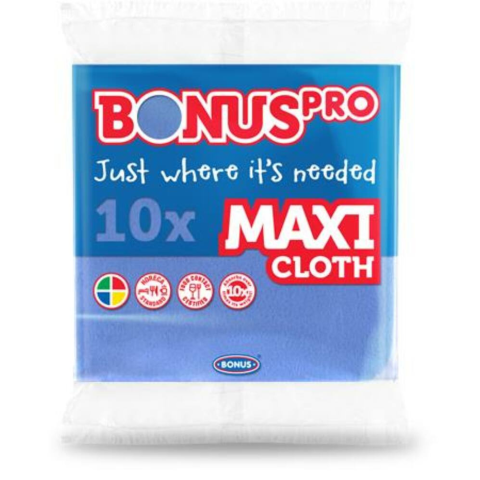 Törlőkendő, univerzális, 10 db, BONUS Professional Maxi, kék (KHT893) A BONUSPRO MAXI törlőkendőt maximálisan a HoReCa szegmens igényeinek megfelelően alakítottuk ki. Mérete 38X40cm, így hatásosan tisztítja a nagyobb felületeket, legyen szó pultokról,