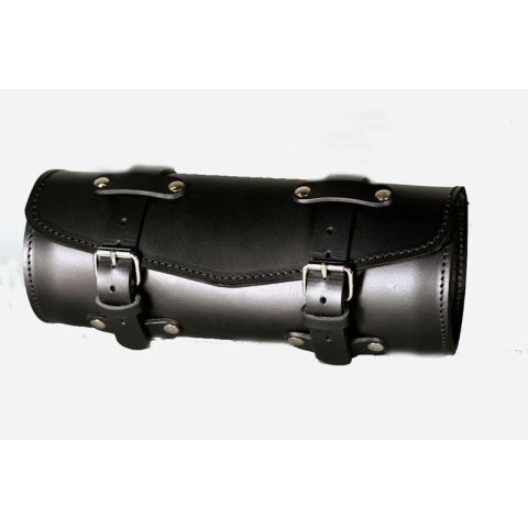 Bőr villatáska, fekete színű, 4 mm vastag marhabőrből. Hossza 30 cm, átmérője 11 cm.