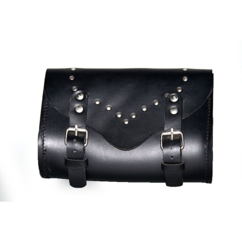 Bőr villatáska, 4 mm vastag marhabőrből. Szélein varrott, 2 csattal, szegecsekkel díszítve. Mérete: 25 x 16 x 11 cm. Utánvéttel nem vásárolható.