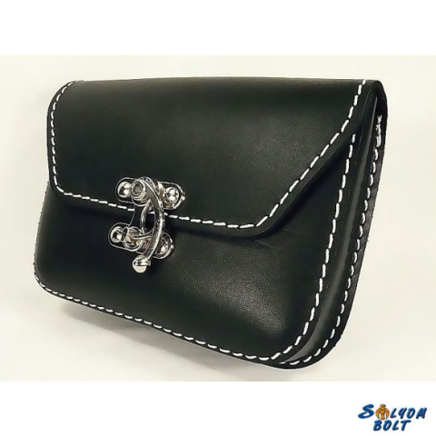 1 kép Bőregér Fekete bőr övtáska, egyfakkos, horgas csatos, fehér varrással