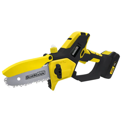 Vezeték nélküli mini láncfűrész BORMANN • Feszültség: 20V • Lánc sebessége: 5,9m/s • Vezetőlemez hossza: 150mm (6) • Biztonsági védőburkolat a lánclap fölött • Biztonsági kapcsoló • Tartozékok: 1 db vezetőlemez és lánc szett, 1 db vezetőlemez burkol