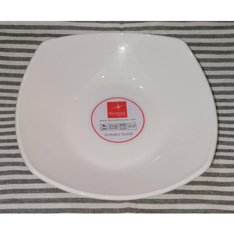 Fehér színű, szögletes formájú üveg desszertes tányér, mérete: 176x176 mm.