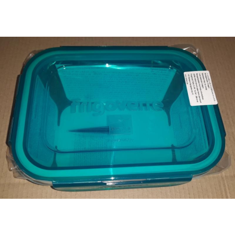 Edzett üvegből készült tárolóedény, türkíz színű műanyag fedővel. A fedő bepattintható így szivárgásmentes tömítést hoz létre. A tárolóedények egymásra rakhatók. Méretei: 18X14X8cm, űrtartalma: 100 cl. Mikrohullámú sütőbe és sütőbe tehető ( ez utóbbiba fedő nélkül!). Mosogatógépben tisztítható. Olasz termék.