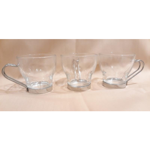Edzett üvegből készült mokkás csésze készlet fém füllel. Átmérőjük: 10 cl (100 ml), magassága: 62 mm, átmérője: 67 mm. Olasz termék.
