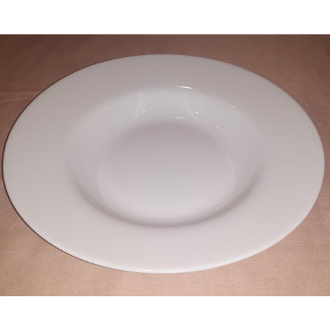 Fehér színű üveg mélytányér/leveses tányér. Átmérője: 24 cm. Olasz termék.
