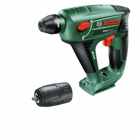 Akkumulátoros fúrókalapács Bosch Uneo MaxxBosch Uneo Maxx akkumulátoros fúrókalapács 3 az 1-ben sokoldalú tehetség akkus fúrókalapács, fúró és csavarozó egyszerre. Egyszerű kalapácsfúrás a legkeményebb anyagokban, pl. betonban és falazatban, az erőteljes pneumatikus ütőmű révén. Különlegesen kényelmes a használata az SDS-Quick befogó révén, amellyel a tartozékok mindössze 3 másodperc alatt cserélhetők. Emellett PowerLight lámpa, elektronikus előre/vissz