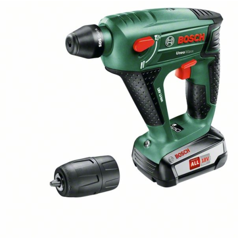 Akkumulátoros fúrókalapács Bosch Uneo Maxx Bosch Uneo Maxx akkumulátoros fúrókalapács 3 az 1-ben sokoldalú tehetség akkus fúrókalapács, fúró és csavarozó egyszerre. Egyszerű kalapácsfúrás a legkeményebb anyagokban, pl. betonban és falazatban, az erőteljes pneumatikus ütőmű révén. Különlegesen kényelmes a használata az SDS-Quick befogó révén, amellyel a tartozékok mindössze 3 másodperc alatt cserélhetők. Emellett PowerLight lámpa, elektronikus előre/viss