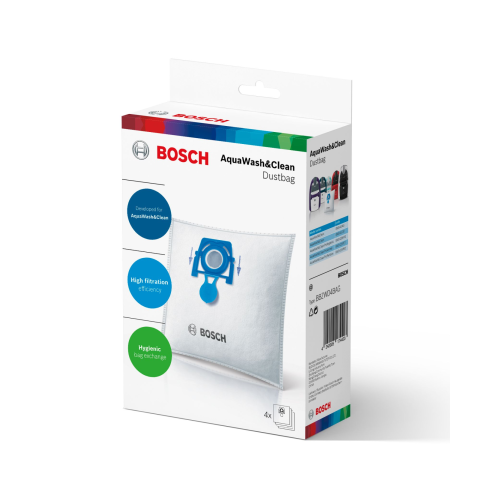 Porzsák csomag (4 db)Eredeti Bosch porzsák, kifejezetten a Bosch AquaWash&Clean takarítógépekhez kifejlesztve.Magas szintű szűrőképesség: élvezze a tiszta levegőt a porzsák erős szűrőteljesítményének köszönhetően.Higiénikus porzsákcsere: a speciálisan kialakított porzsákzáró higiénikus porzsákcserét tesz lehetővé.