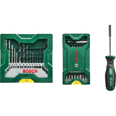 BOSCH Bithegy és fúrószár készlet 41 részes Mini X-Line Két Mini-X-Line vegyes készlet csavarbitekkel és spirálfúrókkal, plusz egy Bosch kézi csavarhúzóval ajándékba. Minden fúrási és csavarozási feladathoz. A 15 részes Mini-X-Line vegyes készlet fala