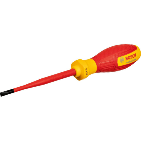 BOSCH Csavarhúzó lapos SL 4,5 x 100 mm 1000 V-ig szigetelt 10 000 V feszültségig tesztelve, és 1000 V feszültségig VDE tanúsítvánnyal rendelkezik a DIN EN/IEC 60900 szabvány szerint Precíz és tartós, keskeny szárral és robusztus heggyel a pontos illesz