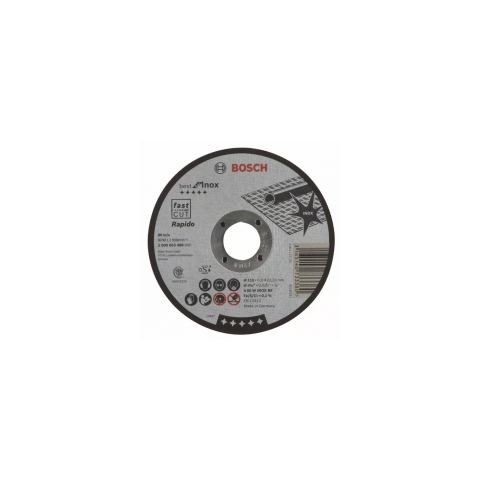 Bosch Darabolótárcsa, egyenes, Best for Inox-Rapido (2608603486)Specifikáció A 60 W INOX BFÁtmérő 115 mmFuratátmérő 22,23 mmVastagság 0,8 mmBest for Inox vágótárcsa kiváló élettartammal a rozsdamentes anyagok vágásáhozA Best for Inox vágótárcsa kiváló élettartammal rendelkezik rozsdamentes acél vágása esetén. Kerámiába ágyazott csiszolószemcséinek köszönhetően a tárcsa kopásállósága kiváló, állandó minőséget garantál, és minimálisra csökk