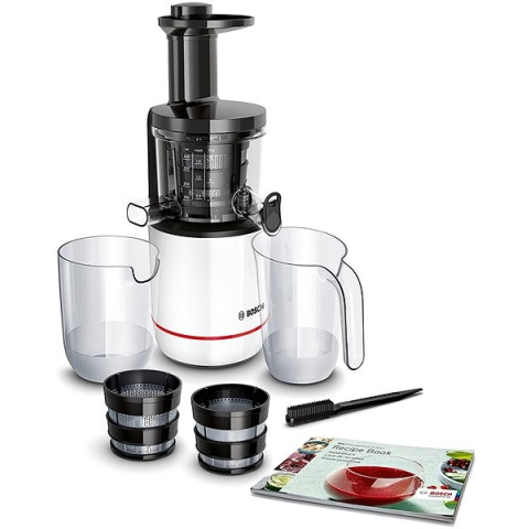 Gyümölcscentrifuga - elektromos, lassúprés, 55 ford/perc, 1 sebességfokozat, létartály űrtartalma 1 l, péptartály űrtartalma 1,3 l, álló tengely, anti drip és mosogatógépben mosható, lassú facsarás, konstrukció anyaga műanyag, csiga anyaga fém, légyűjtő tartály anyaga műanyag, szűrő anyaga rozsdamentes acél, méretei 42,7 × 15,2 × 15,2 cm (ma × szé × mé), létartály, péptartály, nyomóprés és fedél a csomagban A nagy teljesítményű, fehér színű Bosc