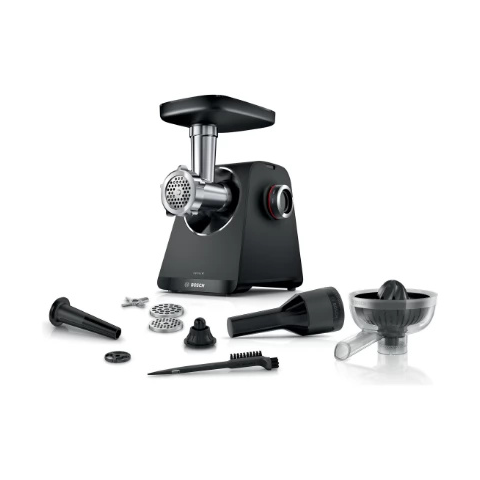 Húsdaráló - elektromos, teljesítmény 1900 W, gumi lábak, kétélű késsel, tárolós és hátramenet, virsli- és kolbásztöltés és őrlés, 2 sebességfokozat, húsfeldolgozási sebesség 2,5 kg/perc, darálás nagysága 3, 4,5 és 8 mm, nyomóprés, kolbásztöltő tartozék és daráló betét a csomag része, daráló mérete 5, anyaga műanyag, BPA Free és fém, mérete 24,7 × 20 × 24 cm (Ma×Sz×Mé), tömege 4,3 kg, fekete kivitel BOSCH húsdarálókBOSCH MFWS430B MultiPower