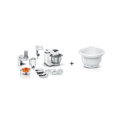 Konyhai robotgép Bosch Serie 2 - bolygóműves keverés, 700 W teljesítmény, műanyag belső áttétel, műanyag burkolat, keverőtál anyaga rozsdamentes acél, keverőtál űrtartalma 3,8 l, 4 sebességfokozat, funkciók habverés, keverés és dagasztás, tartozékok szeletelő feltét, húsdaráló, citrom/gyümölcs prés, ballon habverő, dagasztószár, keverő habverő (spatulás), tál, 3 szeletelő korong, tömege 6,785 kg, mérete 26,6 × 26,6 × 27,7 cm (Ma×Sz×Mé), fehér kivit