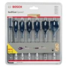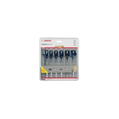 A Bosch Self Cut Speed 7 részes lapos marófúró készlet hosszabbítóval kiegészítve. Háromszor gyorsabban fúr, mint a standard lapos marófúró.Szabadalmaztatásra bejelentett, önbehúzó menetes csúccsal és vágóél geometriával készült. Bosch gyári szabvány szerint gyártva, különlegesen hőkezelt acélból. A nagy pontossággal köszörült csúcs és vágóélek biztosítják a mérettartó furatok elérését. A befogószár 1/4"-os, hatszögletű (DIN 3126 E 63 szeri