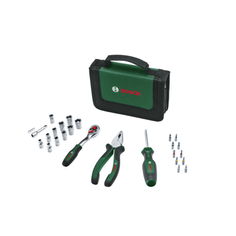 BOSCH Szerszámkészlet 26 részes A kompakt társ számos barkácsolási feladathoz az úton 26 darabos készlet 1 hüvelykes racsnival, kombinált fogóval, univerzális csavarhúzóval, bitekkel stb. Kényelmes tárolás praktikus cipzáras szövettokban A kiváló mi
