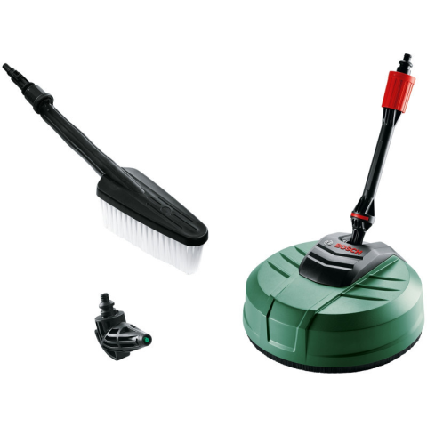 BOSCH Terasztisztító fej + mosókefe + 90° fúvóka Home and Car Kit a tökéletes magasnyomású tisztításhoz Könnyedén távolítja el a szennyeződést autókról, teraszokról és más kültéri felületekről A puha sörtéjű mosókefe kemény munkát végez a piszkos abl