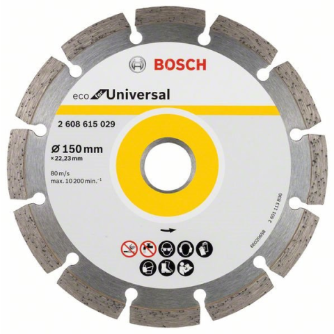 Gyémánt korong - vágó, beton, tégla és kő vágására alkalmas, szegmens, átmérője 150 mm, szerelőnyílás 22,23 mm, vastagsága 2,1 mm, maximális sebessége 10200 ford/perc Eme BOSCH Universal 150 x 22,23 x 2,1 x 7 mm alapvető tulajdonságai A strapabíró Bosch gyémánt korong a profi mesteremberek és a barkácsolók által egyaránt kedvelt A vékony gyémántréteg a pereme körül
