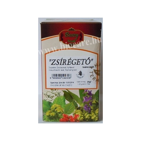 A Boszy Zsírégető teakeverék a fogyókúrás étrend kiegészítésére ajánlott a megfelelő folyadékbevitel pótlására. Összetevők: coleus forskohi, nyírfalevél, rozmaring levél, zöld tea. Elkészítési mód: Egy filtert forrázzon le 100 Cº-os vízzel, hagyja állni 2