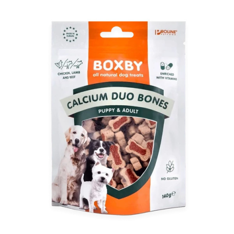 A Boxby Puppy Snacks Calcium DuoBones bárányhúsból készült gluténmentes jutalomfalatok. A, D3, E vitaminnal és kalciummal. A Boxby összeforr a prémium minőséggel. Ha úgy érezzük, hogy ez nem a legjobb termék, akkor biztosra vehetjük, hogy az nem Boxby.
