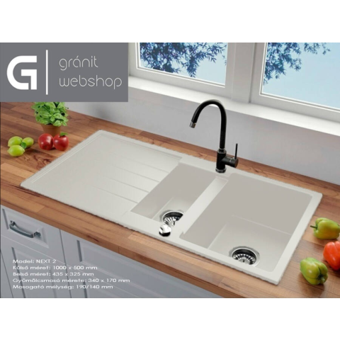Brado NEXT2 másfél medencés gránit mosogató automata dugóemelő, szifonnal, fehér, beépíthető mosogatótálca termékleírás