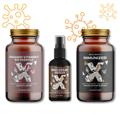 Strong Immunity Kitünk a BrainMax Organic C-vitamint a BIO acerolából, a BrainMax Immunizert és a BrainMax ImmuSpray-t egyesíti az átfogó légzésvédelem érdekében. Az acerola C-vitaminja erősíti az immunitást és megvédi a sejteket az oxidatív stressztől, míg az IMMUNIZER 17 természetes anyagot tartalmaz az immunitás általános támogatására. A BrainMax ImmuSpray gyors enyhülést biztosít a megfázás első tüneteinél, és ideális megelőző használatra.