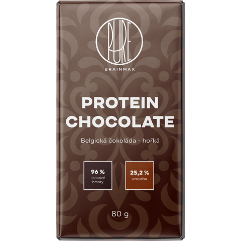 Prémium fehérjetartalmú étcsokoládé magas kakaómassza-tartalommal. A BrainMax Pure Protein csokoládé 96% kakaómasszát és 25% fehérjét tartalmaz. Ezen kívül rostot is tartalmaz. A BrainMax Pure csokoládé nem tartalmaz hozzáadott cukrot vagy pálmaolajat.