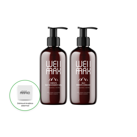 Két termékből álló készlet a WellMax termékcsaládból férfiaknak . Az első közülük a WellMax férfi krém 3 az 1-ben. Pusztán természetes összetételének köszönhetően egy többfunkciós arc- és testápoló krém, amely tökéletesen ápolja a férfiak bőrét. Bio napraforgóolajjal és bio sárgabarackmag olajjal dúsított, amelyek hidratálják és védik a bőrt. A WellMax férfi tusfürdő 3 az 1-ben verbéna, levendula és csalán szerves kivonatát tartalmazza. Enn
