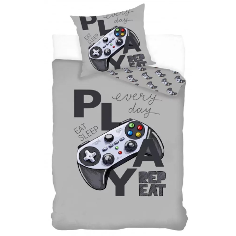 Modern szürke gamer ágyneműhuzat nagyméretű kontroller grafikával és Play – Eat Sleep Repeat felirattal. Letisztult, fiús stílus, amely tökéletes választás minden játékrajongó tininek és felnőttnek. A Gamer Grey ágyneműhuzat puha, 100% pamut anyagból kész
