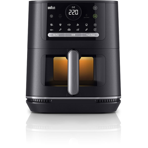 Airfryer - digitális vezérlés, 80 - 220 °C között szabályozható hőmérséklet, tapadásmentes felület, kijelző, termosztát, fedél nyílással, mosogatógépben mosható részek, belső világítás, automatikus kikapcsolás, hőmérséklet szabályozás és automatikus fedélnyitás, 20 program, kivehető edény, 2000 W teljesítmény, 6 l-es edény, kerámia edény tapadásmentes felülettel, 1 fritőz kosár, tömege 5,5 kg, méretei 33,5 × 27 × 28 cm (ma × szé × mé), fekete