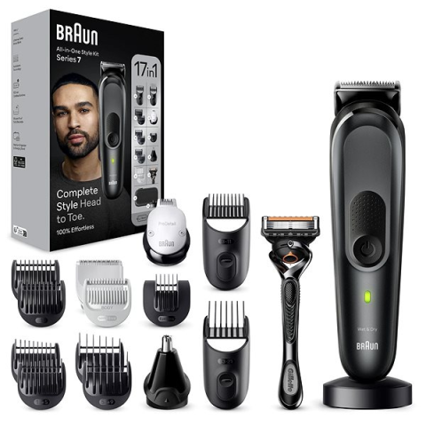 Hajvágó szett - használható hajra és szakállra, orrszőrzetre, intim területeken, fülszőrzetre, testre, szemöldökre, hátra, férfiak részére, funkciók: nedves epilálás és lemosható fej, 9 kiegészítő, min. vágási hosszúság 1 mm, max. vágási hosszúság 21 mm, nyomógombos vezérlés Braun Series 7 MGK7491 - Élesebb. Gyorsabb. Hatékonyabb. A Braun Series 7 MGK7491 akkumulátoros hajvágó minden férfi számára jó szolgálatot tesz a testápolásban, tetőtől talpi