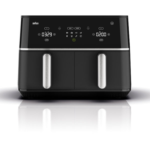 Airfryer - tapadásmentes felület, kijelző, termosztát, mosogatógépben mosható részek, időzítő, automatikus kikapcsolás, hőmérséklet szabályozás, dupla főzés és automatikus programok kerámia tapadásmentes felülettel, 2 fritőz kosár, tömege 8,6 kg, méretei 32 × 39 × 44 cm (ma × szé × mé), fekete kivitel Braun TwinCook 5 TD5030.IBK forrólevegős fritőzA Braun TwinCook 5 TD5030.IBK forrólevegős fritőz két extra nagy, 5 literes kosárral egyszerre készíti el a