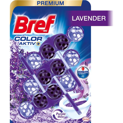WC golyó - a WC higiénikus tisztaságáért és frissességéért, színező, vízkő ellen, klórmentes, üde illatú, tömege 150 g Nincs kitöltve Alternatív szöveg a képre!BREF Purple Aktiv Lavender WC blokkA Color Activ+ WC blokk termékcsalád új összetétele 50%-kal* magasabb fényt kölcsönöz a WC felületének (*egy száraz felületh