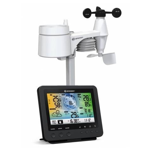 Bresser 5-in-1 Wi-Fi Weather Station with Color Display Compact weather station with colorful display and Wi-Fi Bresser 5-in-1 Wi-Fi Weather Station with Color Display offers comprehensive information service despite its compact design. The multifunctional professional outdoor sensor can be easily installed with the supplied mounting accessories! The professional outdoor sensor transmits measured values for wind speed, wind direction, air humidity, temperature, and rainfall at 868 MHz frequency