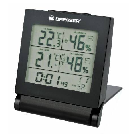 Bresser MyTime Travel Alarm Clock Weather Station Compact digital clock for traveling with temperature and humidity display It is as small and handy as a travel alarm clock and yet offers so much more: that's the Bresser MyTime Travel. Travelers should always take with them this compact digital alarm clock with temperature and humidity display. Since it is purely battery-driven, it can be used anywhere. The sophisticated design impresses with clever details and straightforwardness. On the compac