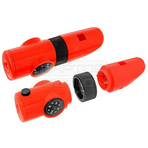 Bresser Junior 6 az 1-ben többfunkciós síp Six-in-one kit: whistle, torch, compass, thermometer, mirror, magnifier Wake up and whistle a happy tune! But this novelty item does a lot more: it also shows you the temperature and enables you to magnify things, or to look at your image in the mirror. The mini torch lights the way for you in the dark and the compass means you'll always know the right way to go! The 6in1 multi-function whistle! Features: Whistle Torch e.g. to signal