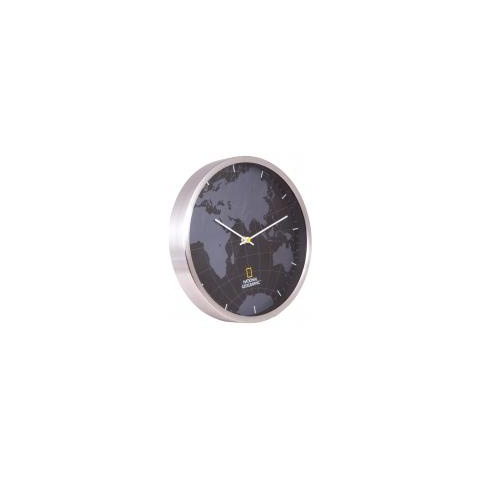 Bresser National Geographic falióra, 30 cm Silent clockwork for undisturbed sleep The National Geographic wall clock with its brushed aluminium frame and the discreet black and grey world map fits perfectly in every living room. Thanks to the silent clockwork it can also be placed in your bedroom, without you waking up at night because of an annoying tick tock. Features: Wall clock with manual time adjustment Brushed aluminium frame Concise dial face with hour and minute hand Silent clockwork R