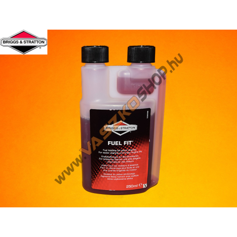 Briggs & Stratton Fuel Fit üzemanyag stabilizátor 992381 Kiszerelés: 250 ml Ajánlott adagolás: 250 ml Fuel Fit üzemanyag adalék 25 liter benzinbe keverve. A Briggs & Stratton Fuel Fit üzemanyag adalék akár 36 hónapig is stabilizálja a benzint és a két üte