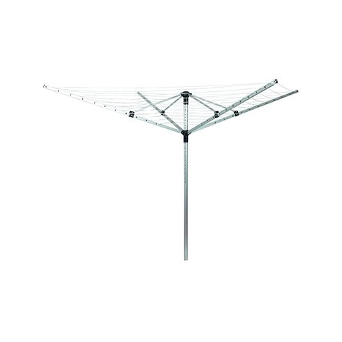 Ruhaszárító - kültéri, álló, összecsukható és forgó, leszúrós, 1 emeletes, teljes szárítási hossz 50 m, a csomag tartalma rögzítő tartozékok, anyaga fém, mérete kinyitva 187 × 173 × 173 cm (Ma×Sz×Mé),, tömege 2,2 kg A kültéri, négy karral rendelkező Brilanz ruhaszárító tartós alumínium szerkezete forgatható és állítható magasságú. Ez az igazán nagyméretű szárító összesen 50 méternyi szárítókötéllel bír, így