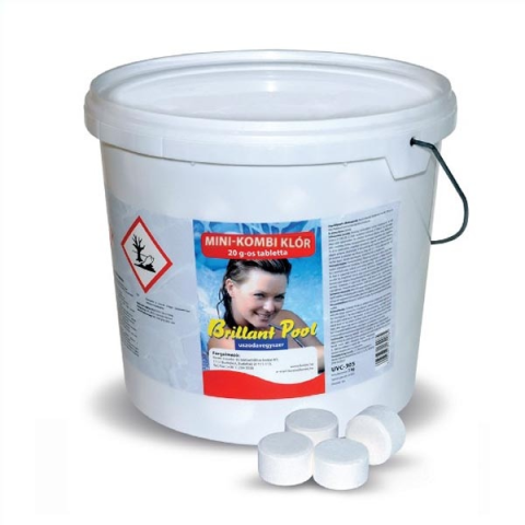 Brillant Pool Mini-kombi klórtabletta, 5 kg Mini-kombi klórtabletta, 90% klórtartalommal,algaölő és pelyhesítő adalékkal, triklórizocianursav hatóanyaggal, lassan oldódó 20 g-os tabletta. Alkalmazása: Állítsuk be az uszodavíz klórszintjét gyorsan old