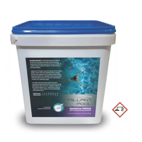 Az OpHtima MINUS egy könnyen oldódó, sósavmentes, savasan reagáló granulátum, amely a medencék pH-értékének csökkentésére szolgál. A granulátumot műanyag kannában 5-10%-os töménységben kell feloldani, majd az oldatot a vízfelszínen szétlocsolni. Az ideális pH érték 7,1 és 7,3 között van. Az OpHtima MINUS gyorsan és hatékonyan állítja be a medencevíz pH-értékét, biztosítva a fürdővíz optimális minőségét. Alkalmazása: A granulátumot műanyag kannába