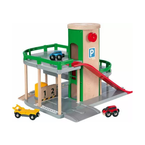 Remek kiegészítő a fa vasútpályákhoz a parkolóház, melyben egy lift is található valamint egy rámpa. A készletben 2 darab kocsit kapunk és egy utánfutót ami egy mágnessel tud kapcsolódni a kocsikhoz.