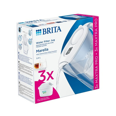 Leírás Marella vízszűrő kancsó, BRITA márka, amely a következőkből áll: - átlátszó műanyag kancsó, teljes űrtartalom 2,4 l, szűrt víz űrtartalom 1,4 l; - speciális tölcsér a szűrőhöz, BPA-mentes műanyagból (Bisphenol A); - MAXTRA PRO típusú szűrőpatro
