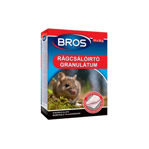 Bros rágcsálóírtó granulátum Bros rágcsálóirtó granulátum az egerek és patkányok korlátozására. A granulátum olyan csalétket tartalmaz, mely erősen vonzza a rágcsálókat és az már az első alkalmazáskor hatásos. A több napon át késleltetett hatás meggátolja